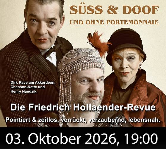Ein Abend voller Chanson, Charme und Chuzpe: Das Trio Dirk Rave (Akkordeon & Arrangements), Chanson-Nette (Gesang) und Henry Nandzik (Gesang & Schauspiel (Gesang & Schauspiel, bekannt bei uns aus La Cage aux folles und Charley´s Tante)) präsentiert mit großer Spielfreude die schillernde Welt Friedrich Hollaenders – dem genialen Komponisten und Texter zwischen Berlin, Hollywood und Kabarett-Olymp.