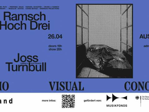 An diesem Abend findet ein Doppelkonzert mit RAMSCH^3 und Joss Turnbull statt. RAMSCH^3 ist ein audiovisuelles Konzertformat, das Kommunikationsformen zwischen Schlagzeug/Objekten, modularen Synthesizern, präparierter Violine und Overhead-Projektionen... mehrzu: Ramsch³ (Ronja Sophie Putz / Raphael Schuster / Isabella Forciniti / Katrin Bethge) and Joss Turnbull