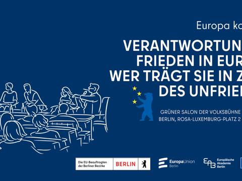Frieden in Europa ist fragil – und die Frage, wer ihn sichert, beschäftigt viele Berliner:innen. In einer Zeit globaler Spannungen diskutieren wir, wie gerechte und nachhaltige Friedenspolitik aussehen kann, wer Einfluss nimmt und wie europäische Entscheidungen... mehrzu: Europa kontrovers: Verantwortung für Frieden in Europa – wer trägt sie in Zeiten des Unfriedens?