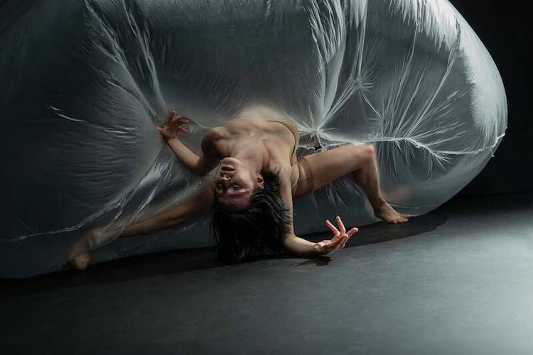 The Cloud is a choreographic work created by Elizaveta Poliakova in collaboration with Dominic Kiessling that explores instability, resistance, and transformation. The piece unfolds within a constantly shifting environment, where movement of the body emerges in response to pressure, friction, and moments of alignment with the art object Cloud. The performer navigates between states of control and loss of control, generating a physical landscape that is both precise and unpredictable.