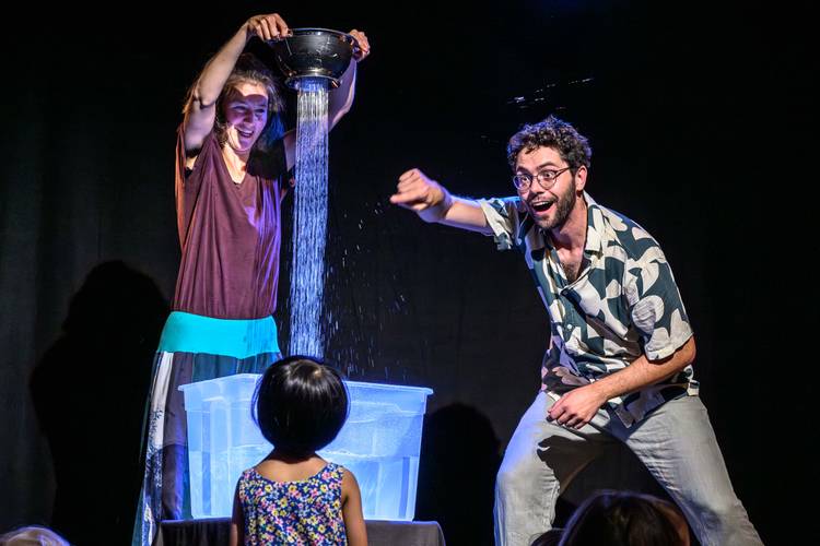 Das Publikum wird aktiv eingebunden in die Entdeckung von Klängen und die Entstehung von Musik. Bodypercussion, Melodien, Tanz und schauspielerische Elemente vermischen sich zu einer nonverbalen Performance mit Witz und Leichtigkeit.