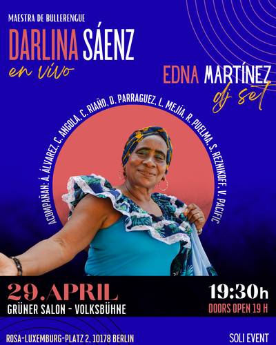 Die traditionelle Bullerengue-Sängerin Darlina Sáenz teilt auf seltener Europatour das Erbe ihrer Mutter Eloisa Garcés live auf der Bühne. Im Grünen Salon wird sie von Bullerengue-Praktizierenden aus Berlin, Hamburg und London begleitet, während DJ und Kuratorin Edna Martínez den Abend mit einem karibisch-verwurzelten und afrodiasporischen Set ausklingen lässt, das Tradition und zeitgenössischen Ausdruck vereint.