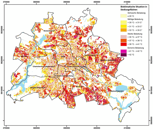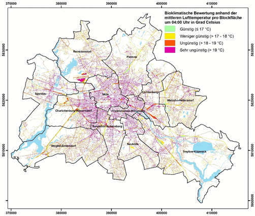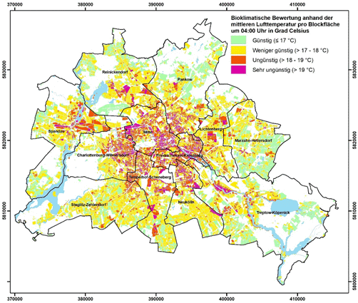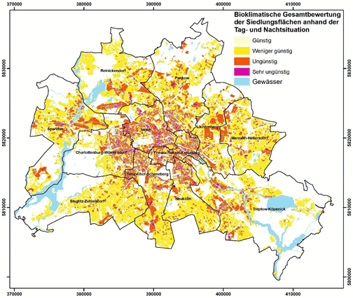 Abbildung 13: Räumliche Verteilung der Bewertungsklassen zur bioklimatischen Situation von Siedlungsflächen in Berlin (Tagsituation)