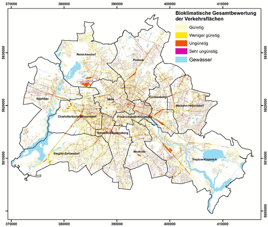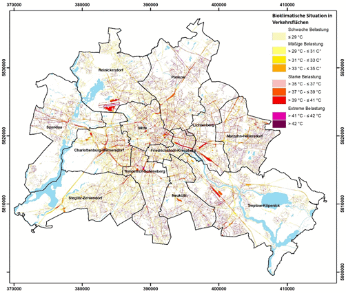 Abbildung 15: Räumliche Verteilung der Bewertungsklassen zur bioklimatischen Situation von Verkehrsflächen in Berlin (Tagsituation)