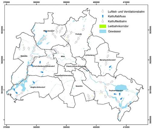 Abbildung 7: Kernzonen der Kaltluftleitbahnen („Leitbahnkorridore“) in Berlin