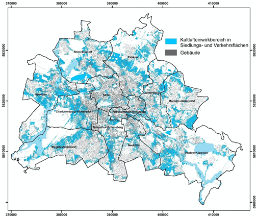 Abbildung 8: Kaltlufteinwirkungsbereich der Komponenten des Berliner Luftaustauschsystems bei autochthonen Wetterlagen