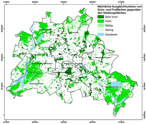 Abbildung 11: Räumliche Verteilung der Bewertungsklassen zur klimaökologischen Schutzwürdigkeit der Grün- und Freiflächen in Berlin