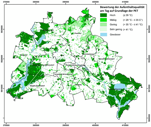 Abbildung 17: Räumliche Verteilung der Bewertungsklassen zur bioklimatischen Situation von Frei- und Grünflächen in Berlin (Tagsituation)