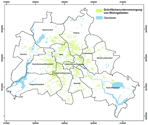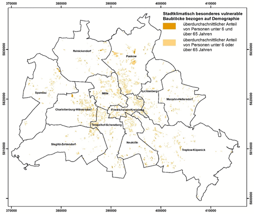 Abbildung 30: Räumliche Darstellung von Flächen mit einer besonderen Vulnerabilität gegenüber dem Stadtklima aufgrund einer Grünflächenunterversorgung in Berlin