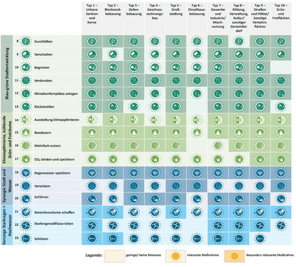 Abbildung 32: Relevanz von Klimaschutz- und Anpassungsmaßnahmen für Stadtstruktur- und Flächentypen aus den StEP Klima 2.0, angepasst