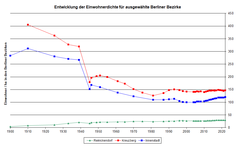 Abb. 2: Entwicklung der Einwohnerdichte Berlins für ausgewählte Bezirke (Einwohner pro Hektar der Bezirksfläche), Stand 31.12.2024
