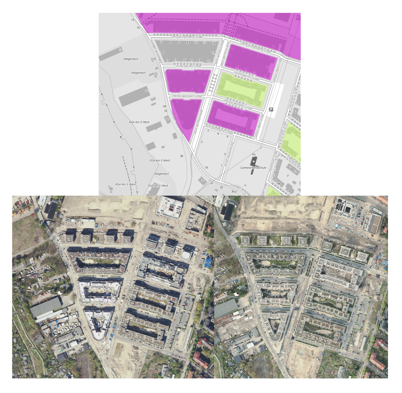 Abb. 4: Zunahme der Einwohnerdichte (Ew/ha) um knapp 400 und 100 Personen in zwei Wohnblöcken zwischen 2022 und 2023 durch Neubaumaßnahmen im Stadtgut Hellersdorf,