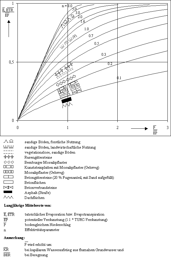 Abb. 3: Darstellung der Bagrov-Gleichung für ausgewählte Werte des Parameters n und Abhängigkeit dieses Parameters von Landnutzung und Bodenart