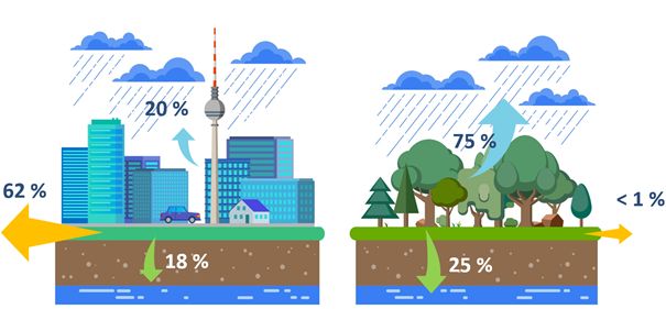 Abb. 1: Typischer Wasserhaushalt von versiegelten Flächen und Vegetationsflächen (blaue Pfeile: Verdunstung, gelbe Pfeile: Oberflächenabfluss, grüne Pfeile: Versickerung)