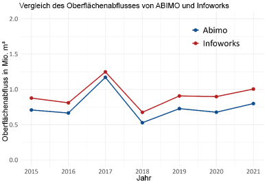 Abb. 4: Vergleich des Oberflächenabflusses von ABIMO und Infoworks (KWB 2025)